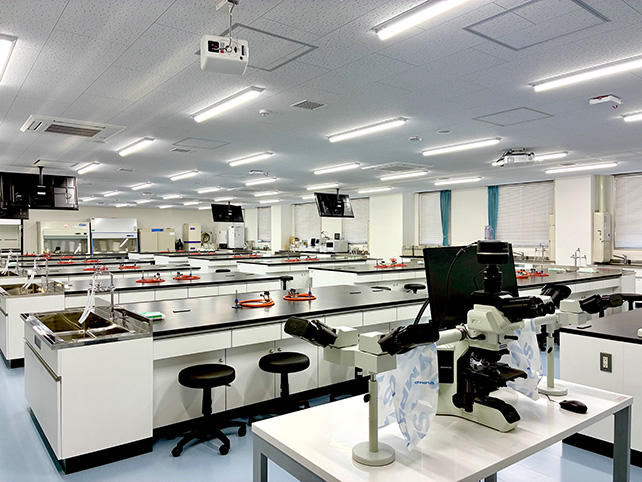 P棟は2025年に完成しました。医学検査学科で使用する実習室が完備されており、最新の研究設備も揃っています。教員研究室もP棟内にあるため、なにかあればすぐに教員に質問ができる環境が整っています。