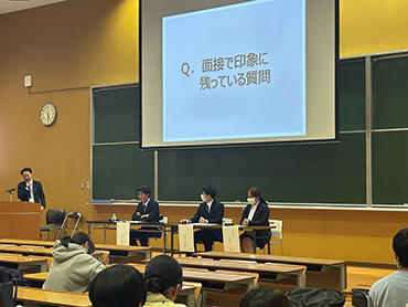 11月13日(木)に「公務員試験対策ガイダンス(秋)」を開催し、「東京アカデミー」様より講師をお招きし、公務員試験の概要や対策方法、スケジュールについてご説明いただきました。また、本学の公務員内定者による体験談も実施され、参加学生にとって大変参考になる内容となりました。各学科から85名の学生が参加し、低学年の学生も参加しており、早期から公務員への意識づけを図る良い機会となりました。