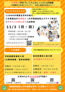 11月3日(日・祝)大田原キャンパスで、高校3年生を対象に作業療法学科によるプレミアムカレッジを開催します!作業療法学科の紹介に加え、大学関連病院より作業療法士の現場をライブ配信で紹介。実際の医療現場で働く作業療法士が、作業療法について詳しくお伝えします。医療系・リハビリ系への進学で悩んでいる方、第2・3希望で作業療法を考えている方是非ご参加ください、当日は風花祭(大学祭)も開催していますので、お待ちしております。