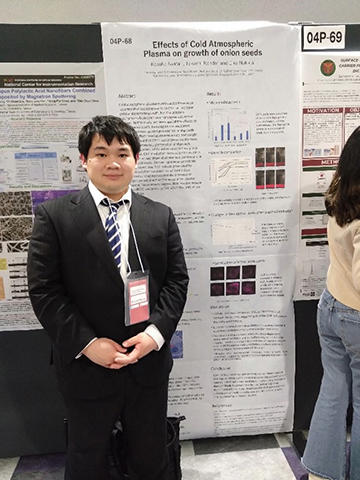 2026年3月2日~6日まで、名古屋市の名城大学で行われた、ICPlasma2026/IC-PLANTS2026という国際学会に仲田研究室の大学院生、岩田光翼君が研究成果を報告してきました。学会には仲田研究室に新配属された4年次の篠原健太君も参加しました。国際学会なので、資料は全て英語、そして会場内の公用語が英語という厳しい環境でしたが、頑張って成果を報告しました。外国人の研究者も多い中、英語をもっと話せるようにして世界中の研究者と議論できるようになりたいと思いました。外国人の研究者の他にも他大学の大学院生と研究の議論が出来、非常に刺激的で実りの多い学会となりました。また、仲田栄子教授の共同研究先である、名古屋大学低温プラズマ科学研究センターを近藤隆客員教授の案内で見学させていただきました。最先端のプラズマ研究の拠点であるこの施設は、研究室毎の壁を取り払う形で、ワンフロアに多種多様なプラズマ関連の機材が設置してあり、機械の間に研究者が見え隠れしている状況で非常に斬新でした。施設で目にした全てに圧倒されました。名古屋大学の敷地も広大であり、街中ながら緑の多いキャンパスでした。お昼は名古屋大学の学食を食べてきました。